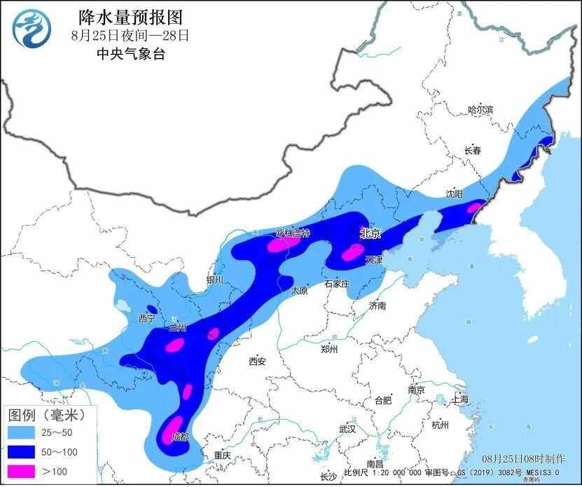 中央气象台预计,25日夜间至28日,西北地区东部、内蒙古中东部、华北及辽宁、四川盆地等地有中到大雨,青海东部、甘肃中南部、宁夏南部、陕西北部、内蒙古河套、山西北部、北京西部和北部、河北中北部、天津、辽宁东部、四川盆地西部等地部分地区有暴雨,甘肃南部、内蒙古河套东部、河北中部、北京西部等局地有大暴雨。