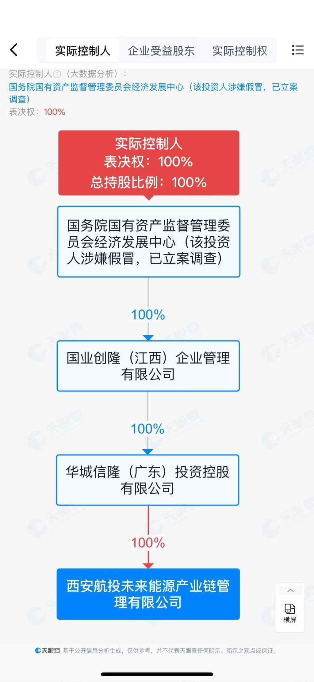 工商信息显示,西安航投未来能源产业链管理有限公司成立于2023年,法定控制人为杨震虎,企业注册资本为3000万元。股权穿透后,该公司由国业创隆(江西)企业管理有限公司(以下简称“国业创隆”)旗下的华城信隆(广东)投资控股有限公司(以下简称“华城信隆”)100%持股,而国业创隆由“国务院国有资产监督管理委员会经济发展中心”全资持有。