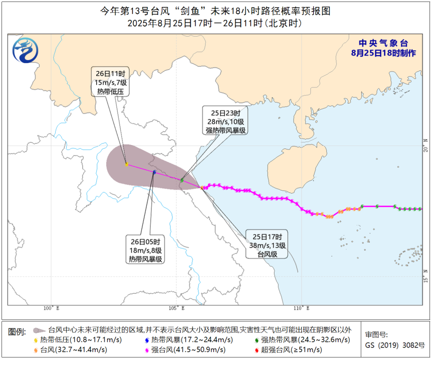 根据中央气象台观测,今年第13号台风“剑鱼”的中心,已于25日19时10分左右,在越南河静省北部沿海登陆,登陆时中心附近最大风力达到13级(38米/秒),预计“剑鱼”登陆后强度将快速减弱。广东省气象部门25日预计,随着“剑鱼”登陆越南并减弱,广东的雨势也将有所减弱。预计28日前后,或再有新的热带系统影响广东。
