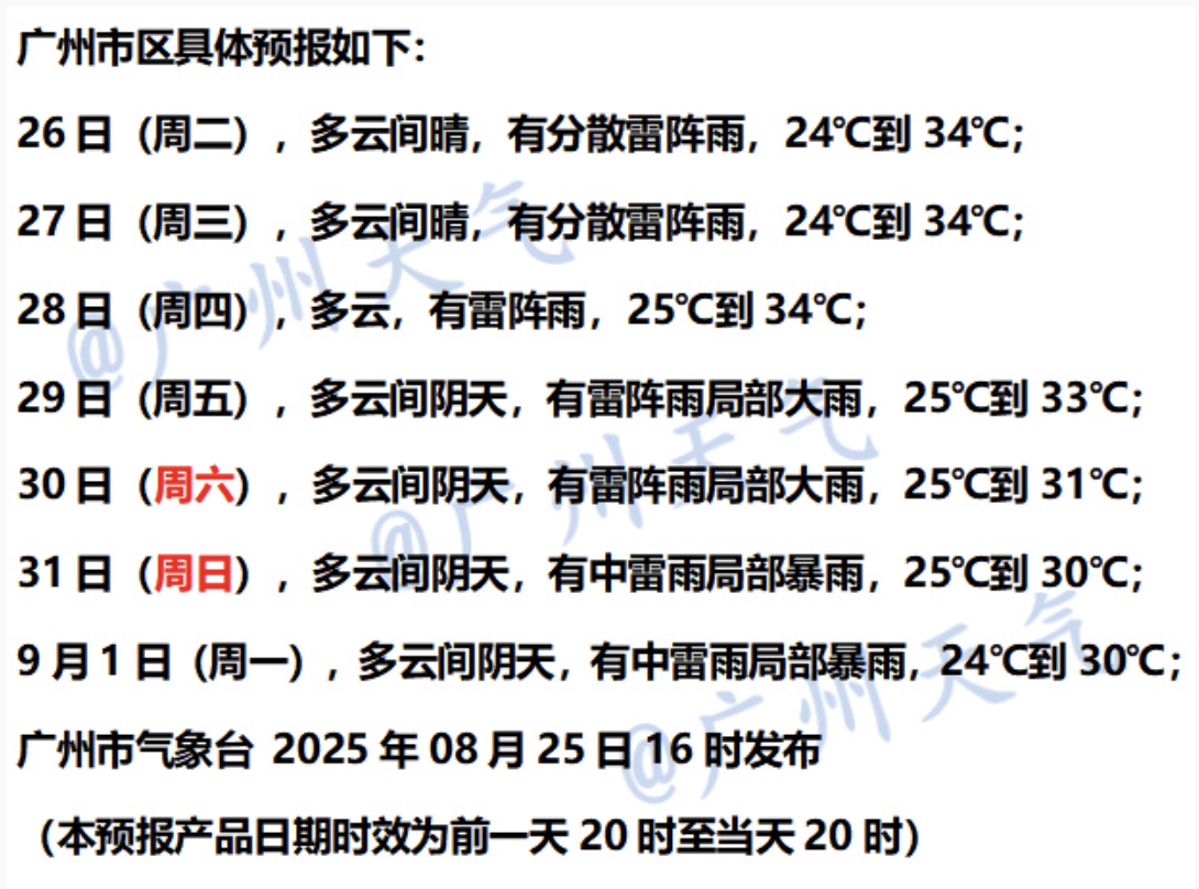 广州市气象台8月25日预计,台风“剑鱼”对广州的影响趋于结束,26日至27日广州以多云为主,间有雷雨,最高气温34℃左右。