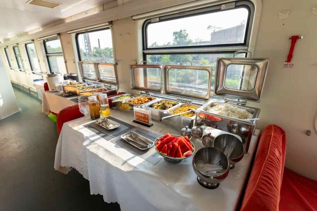 针对旅客来自不同地区、饮食习惯各异的实际,这趟列车餐饮服务全面升级,精心设计自助餐菜单,分时段推出自助餐服务,在早餐提供多款营养主食和小菜,午晚餐提供4荤4素、2款汤品和1种时令水果,并且按照旅客饮食喜好调整菜谱,不断优化旅客乘车体验。