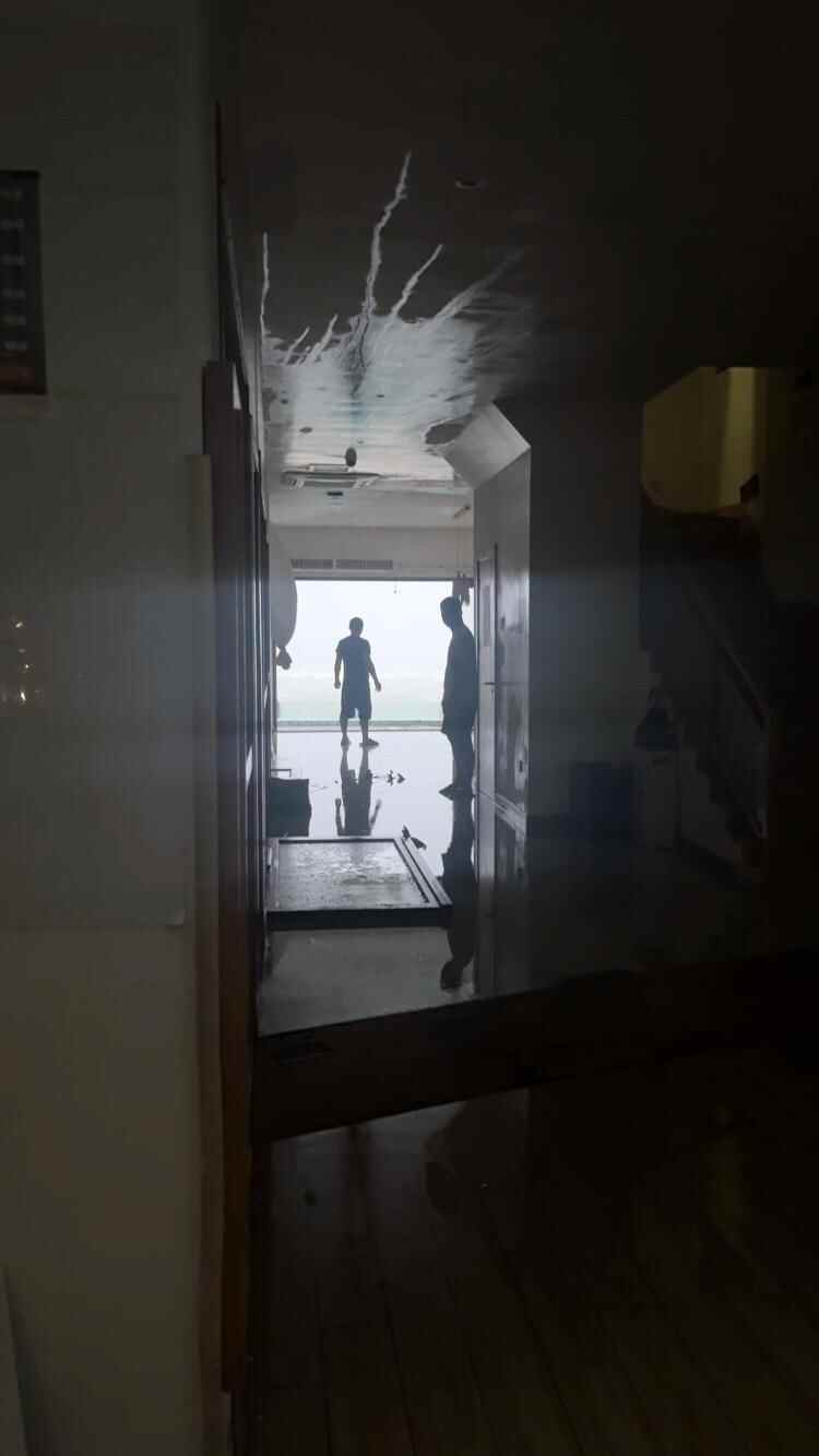 在窦女士发布的视频里,可以看到房东和工作人员在努力顶住大门,避免风吹进屋内。窦女士透露:“当时民宿的人合力拉了半个小时的门,找了各种东西去捆,绳子都断了好几次,最后是用铁丝绑住了大门。但是没想到一楼大厅的推拉门没顶住,被风吹开后穿堂风直接把对着大海的三个小门全部吹‘炸’了……当时,风卷着雨、海水和沙子,全部吹进了屋里,连房顶都湿了。”