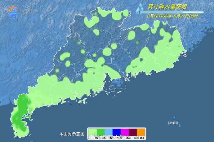 26日,粤西市县多云有(雷)阵雨局部大雨,珠江三角洲南部、粤东、河源和梅州等市县多云,有分散(雷)阵雨,其余市县多云,局部有(雷)阵雨。最高气温:粤西市县29~32℃,其余市县33~36℃。