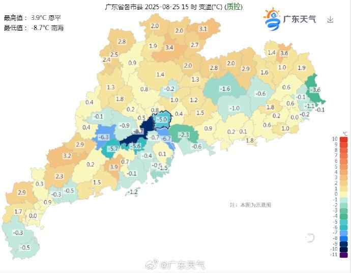 受到雨水“照顾”的地方,气温明显下降。昨天15时,广东全省气温介于24℃~35.8℃之间,这波降水使得珠三角中西部地区在三小时内降温明显,南海更是降了8.9℃。