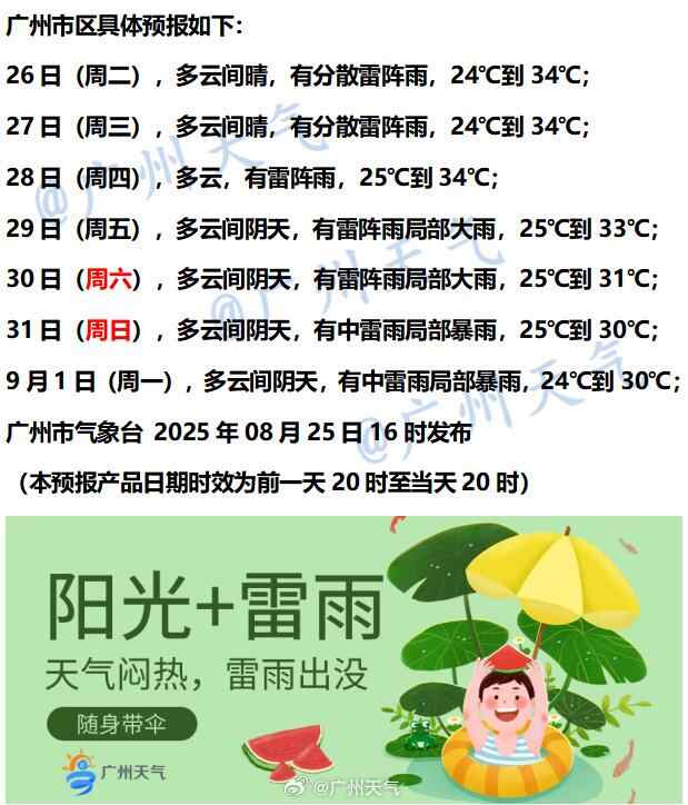 @广州天气 预计,26-27日多云为主,间中有雷雨,体感炎热,大家注意防暑防晒;28日起,又有南海热带系统移近,雷雨又趋明显。