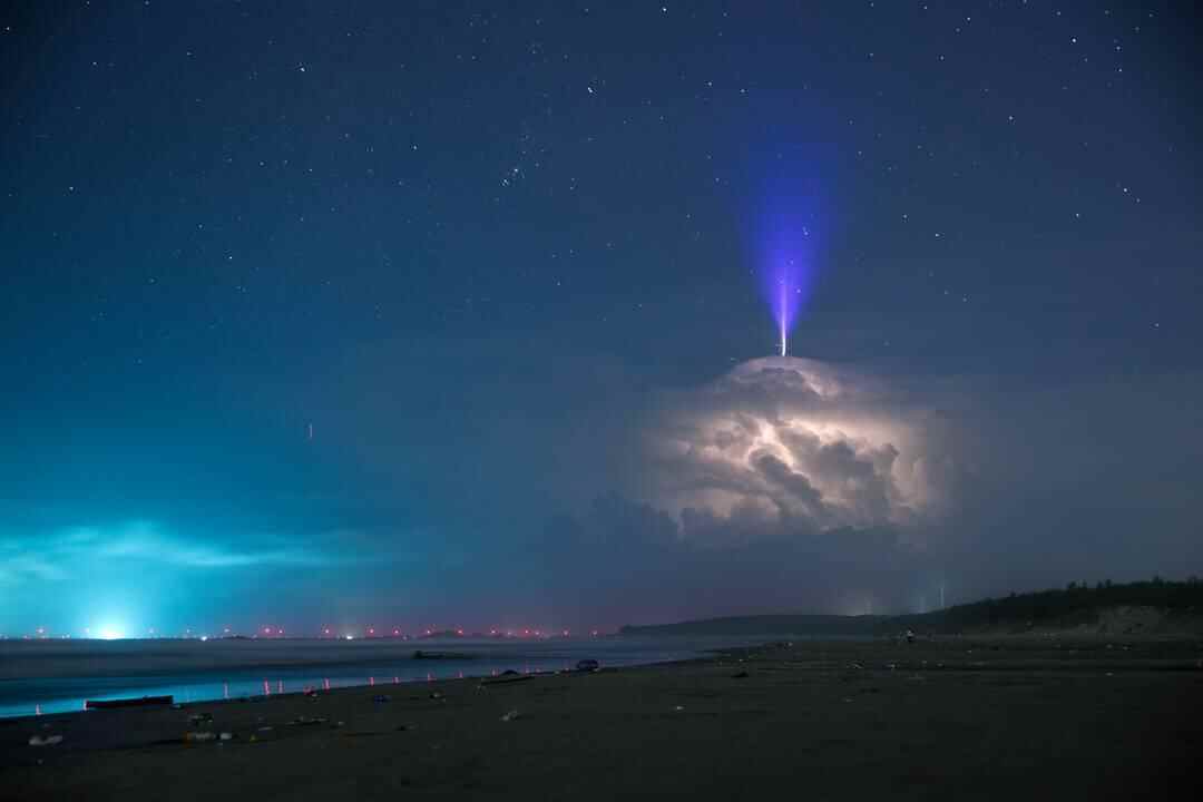 蓝色喷流是从雷暴云顶向上喷射的、呈蓝色圆锥形的短暂放电现象,要想拍到非常难,它发生的时间很短暂,通常只有几百毫秒。