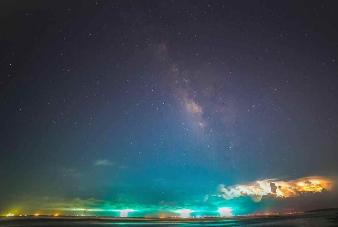 辛宏彪告诉记者,8月23日晚上,自己在广东陆丰王连长纪念堂附近一处人少的海滩带孩子搭帐篷玩,当时是把三脚架架在海边上,本来准备延时摄影拍银河的,“没想到三脚架被海浪冲歪了一下方向,结果正好拍下了雷暴云中的蓝色喷流。”“我还在收拾东西,结果孩子告诉我说天上有一道闪电……”