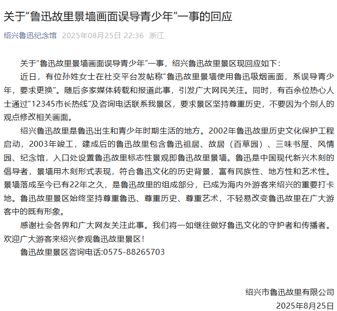 8月25日晚,绍兴鲁迅故里景区通过微信公众号回应关于“鲁迅故里景墙画面误导青少年”一事: