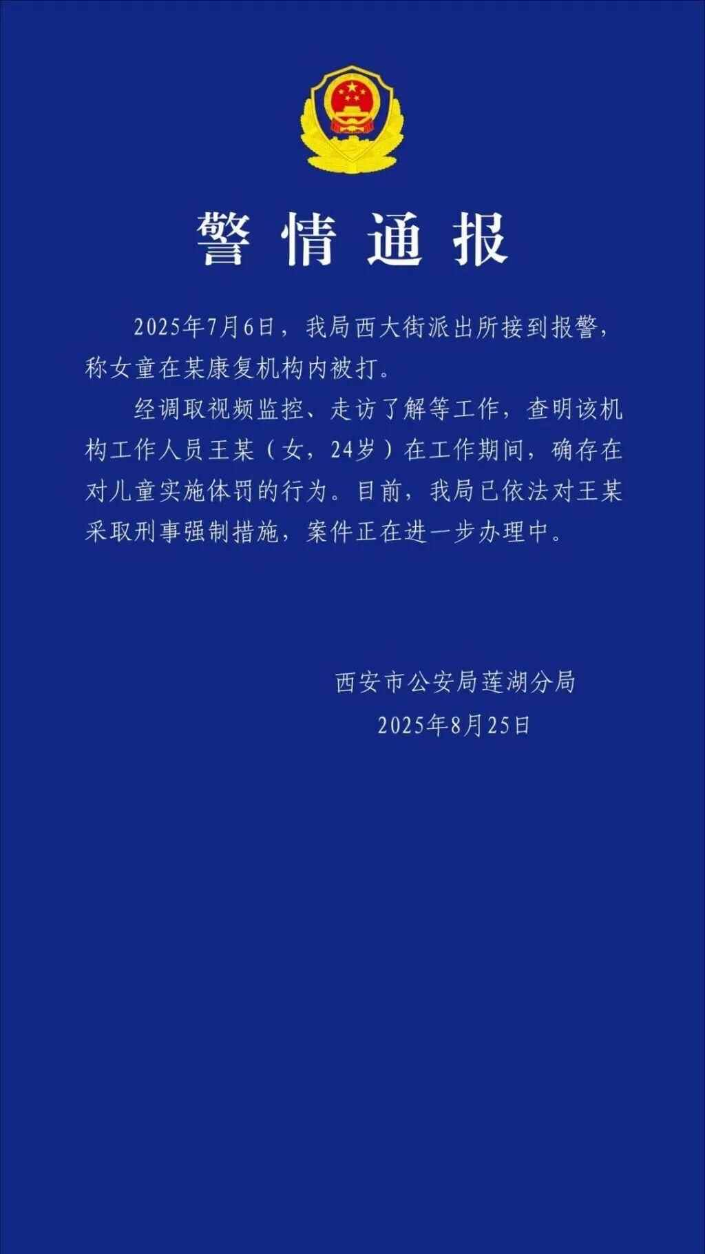 2025年7月6日,我局西大街派出所接到报警称女童在某康复机构内被打。