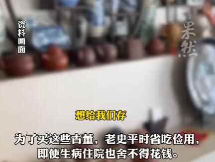 8月22日(采访),家住平顶山的老史因病去世后,妻子整理遗物发现他留下了一间房的“古董”。其中有十斤重的“和田玉”籽料,帝王生肖玉玺,绝版纪念币等,按照标价估值近10万。家人拿去鉴定发现,绝大多数都是赝品,实际价值不到十分之一。原来这些“古董”都是老史听人推荐购买的,为了买这些古董,平时省吃俭用,即使生病住院也舍不得花钱。妻子崩溃:丈夫一直说有钱,去银行一查只剩7块5。女儿又心疼又生气:父亲心是好的,花光一辈子积蓄就想给子女存点钱。