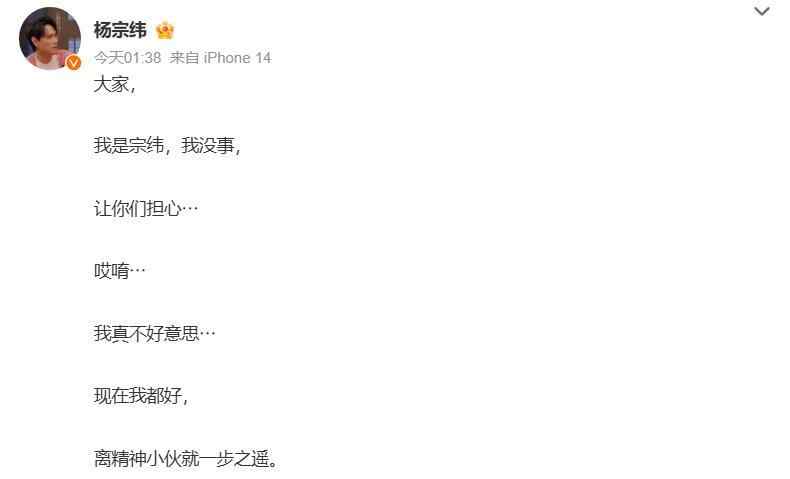 8月24日凌晨,杨宗纬在微博发声报平安:“大家,我是宗纬,我没事,让你们担心。哎唷,我真不好意思,现在我都好,离精神小伙就一步之遥。祈求老妈别看热搜,莫为儿孙作马牛,担忧西又担忧东。”