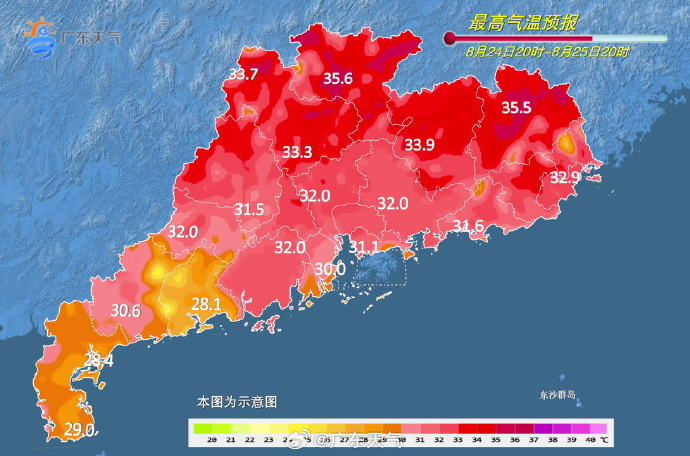 25日最高气温:粤北市县32~35℃,南部沿海市县27℃~30℃,其余市县30℃~32℃。