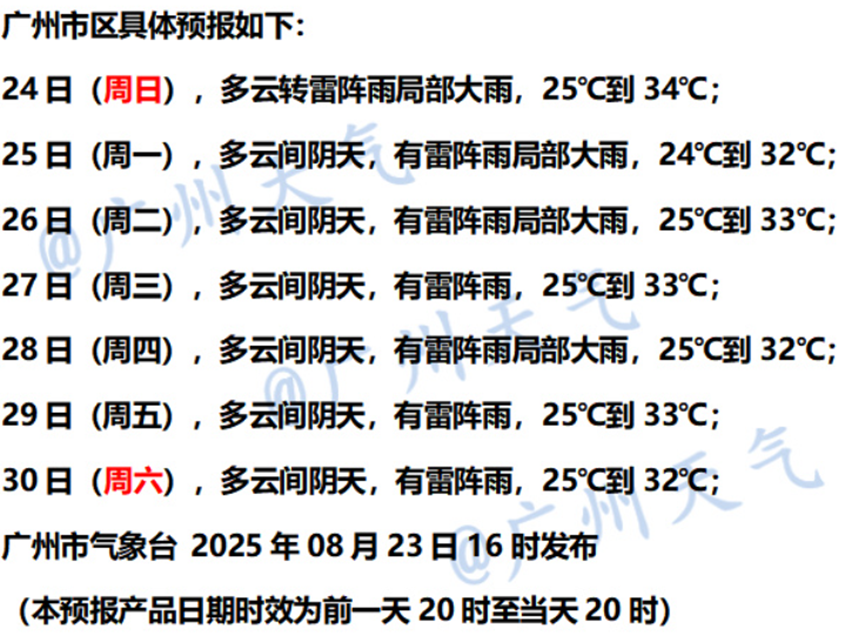 广州方面,本周末高温渐显,且受台风“剑鱼”外围环流影响,8月24日起广州雷雨趋明显,需要防御局地短时强降水及雷雨大风等强对流天气。