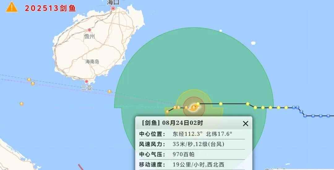 24日08时台风“剑鱼”(台风级)其中心位于距离海南省三亚市东偏南方向约210公里的海面上,也就是北纬17.3度、东经111.2度,中心附近最大风力13级(38米/秒),中心最低气压为965百帕。
