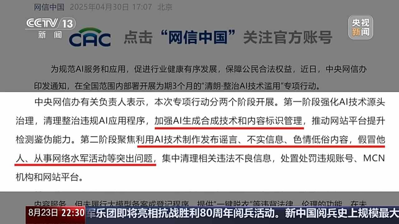 说到规则,关于AI合成内容,几天后的9月1日,网信办等四部门印发的《人工智能生成合成内容标识办法》将开始施行,它明确规定服务提供者,应当对文本、音频、图片、视频等生成合成内容,在适当位置添加显式标识,也就是说今后所有AI作品必须亮明身份,标注是AI生成。它的实施,能改变当下AI出现滥用的现状吗?