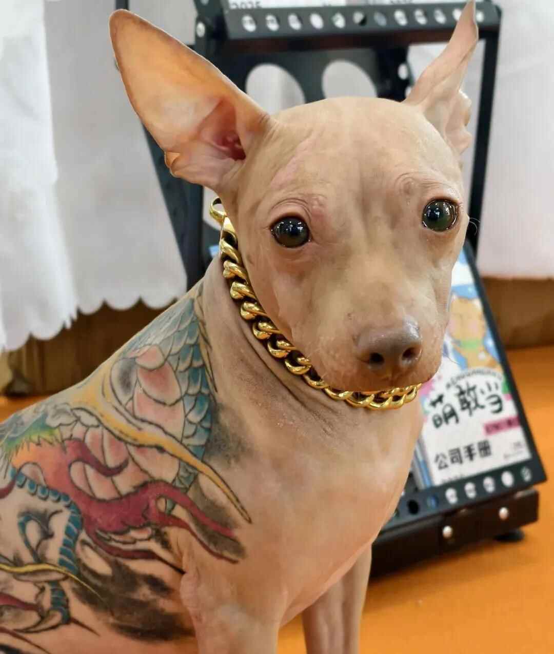 8月22日,有网友发视频称在上海亚洲宠物展览会中看到一只墨西哥无毛犬,其背部有“左青龙右白虎”的文身还戴着金链子、小手表等饰品。