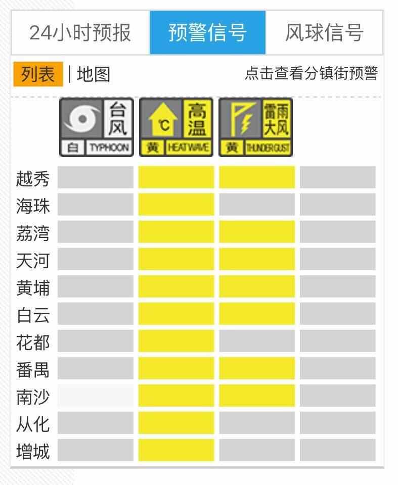 截至8月24日11时58分,越秀、荔湾、天河、黄埔、白云、番禺、南沙等区,已经发布雷雨大风黄色预警信号,南沙区维持发布台风白色预警信号,广州各区维持发布高温黄色预警信号。