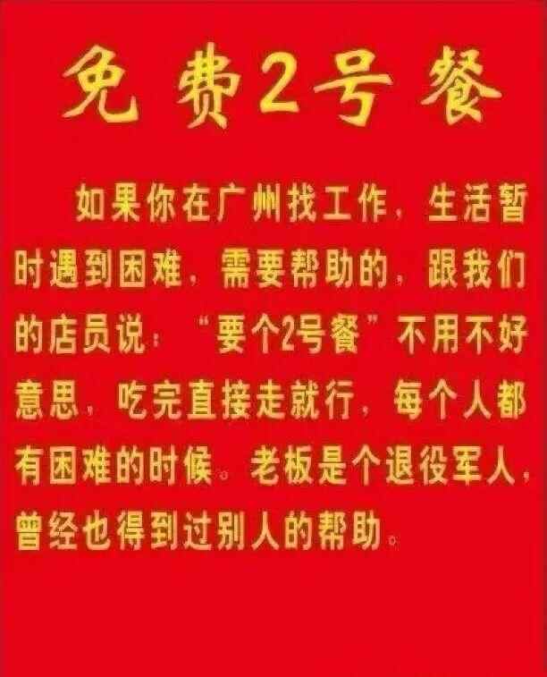 少年口中的“2号餐”是添记隆江猪脚饭的“招牌菜”,这家位于广州市番禺区的饭店门口常年立着一块牌子,上面写着:“如果你在广州找工作生活暂时遇到困难需要帮助的,跟我们的店员说:‘要个2号餐’,不用不好意思,吃完直接走就行。”饭店老板黄展护是一名退役军人。