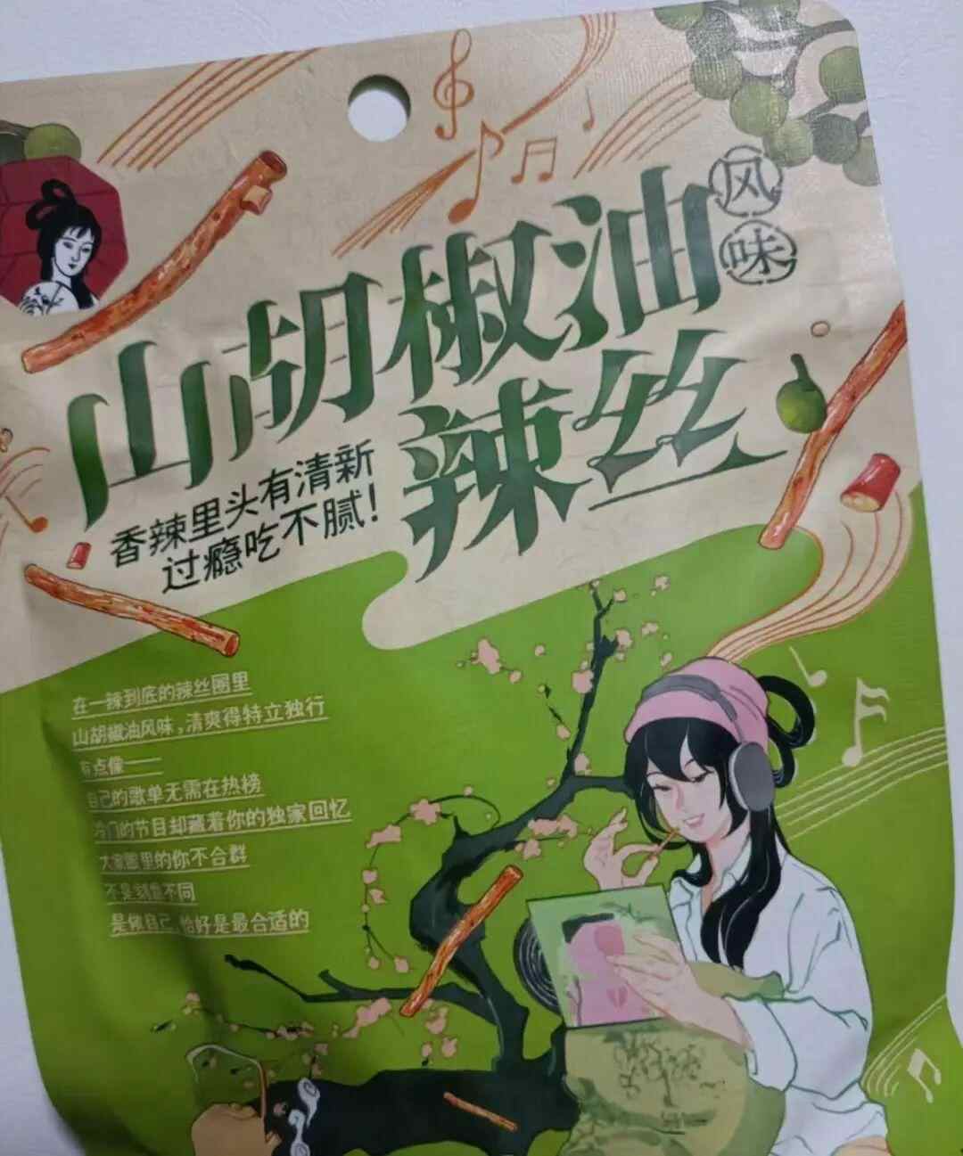 网传图片显示,茶颜悦色一款名为“山胡椒油风味辣丝”零食包装上,一位女生正在听着歌曲品尝辣条,手上还拿着一张音乐专辑,与方大同《梦想家》的专辑封面极为相似。
