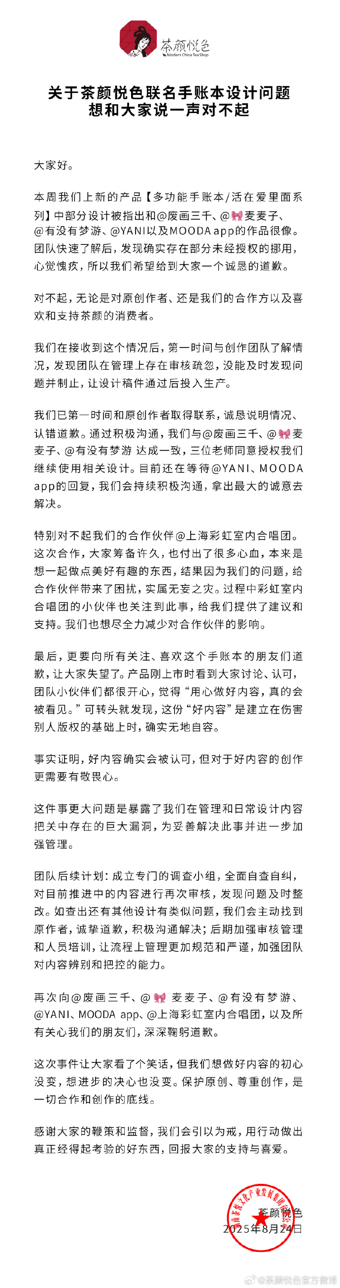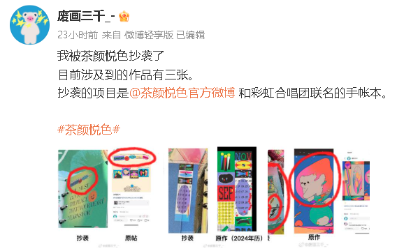 8月24日,多位博主先后在社交平台发文称,茶颜悦色与彩虹室内合唱团联名的手账本涉嫌抄袭其作品。针对此事,茶颜悦色在其中一位博主“废画三千”@废画三千_- 的评论区回复称“我们很重视,也在迅速自查了解情况中”。