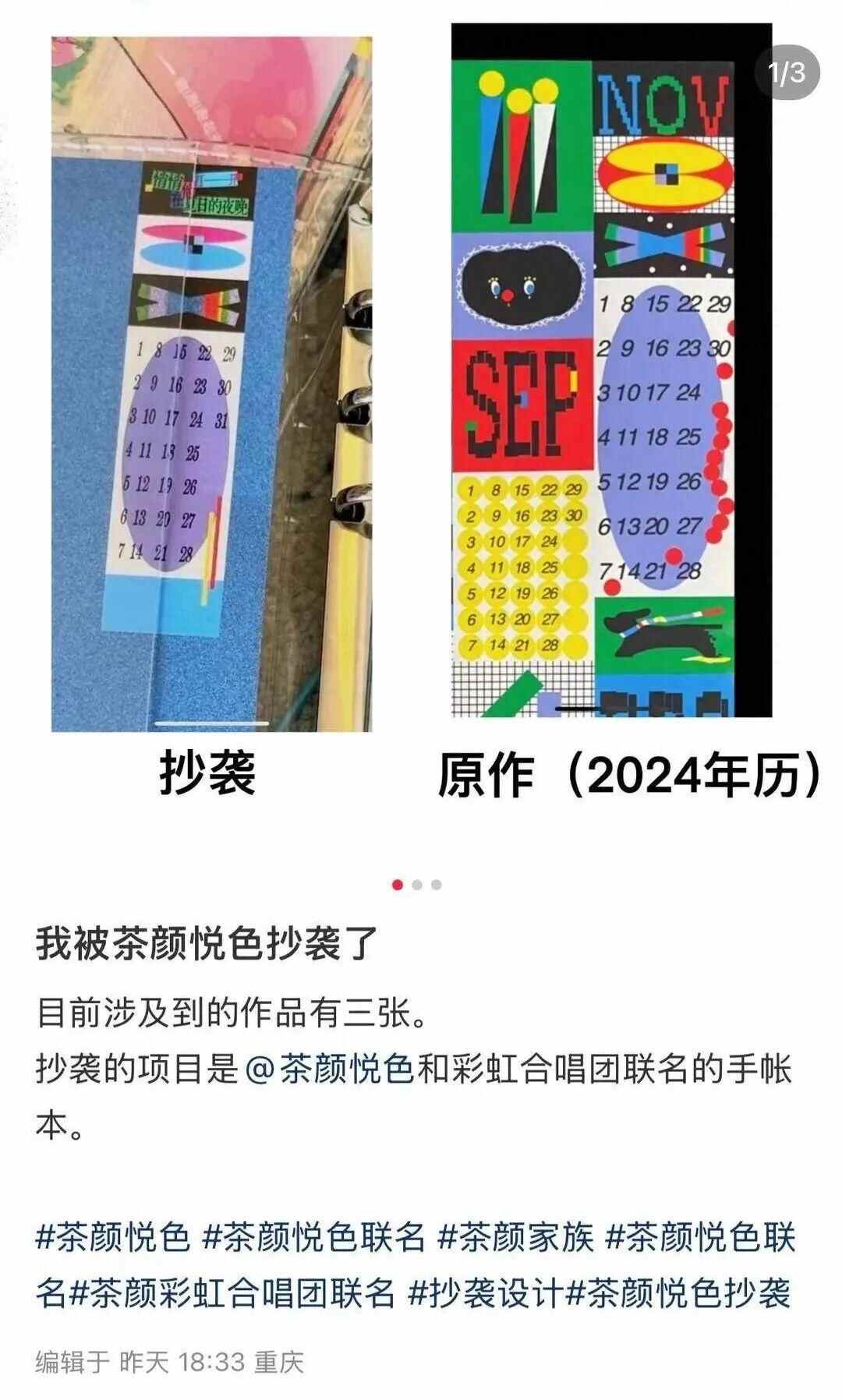 然而仅一天后,8月23日晚间,小红书用户“废画三千”发文称“我被茶颜悦色抄袭了”,明确指出涉事手账本中三处设计与其作品有相似之处,并附上对比图片。