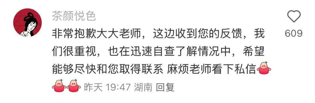 同时,茶颜悦色官方旗舰店客服对此表示,“目前您反馈的情况已经接收到,我们也很重视,正在向上反馈中,非常抱歉给您带来不好的体验。”