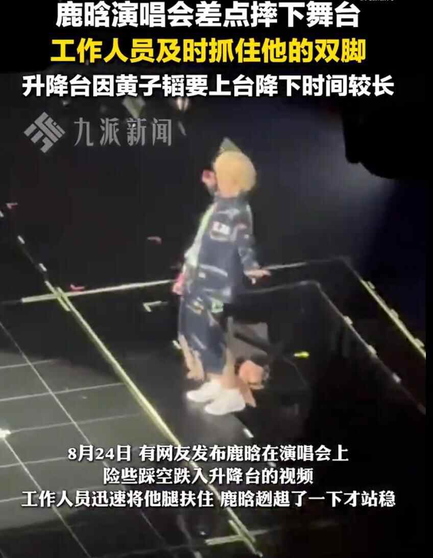 8月24日,有网友发布鹿晗在演唱会上险些踩空跌入升降台的视频,工作人员迅速将他腿扶住,鹿晗趔趄了一下才站稳。据悉,该段视频拍摄于8月22日的深圳演唱会,升降台当时是因为黄子韬要上台,降下去的时间比较长。