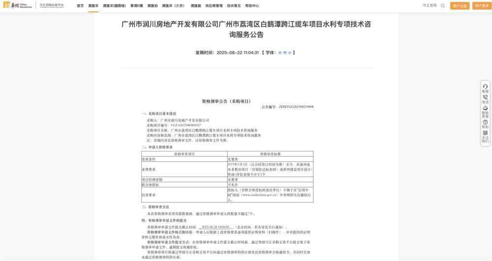 近日,华润集团统一的交易服务平台——华润守正采购交易平台发布的《广州市润川房地产开发有限公司广州市荔湾区白鹅潭跨江缆车项目水利专项技术咨询服务公告》(以下简称《公告》)透露了相关项目信息。