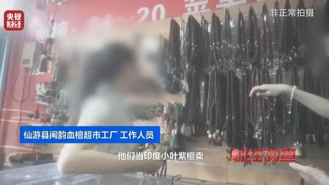 记者以进货名义走访其他直播电商供应链门店时,个别店家还主动“支招”。闽韵血檀超市工厂工作人员坦言,约20元的血檀手串,也可以当作印度小叶紫檀卖。
