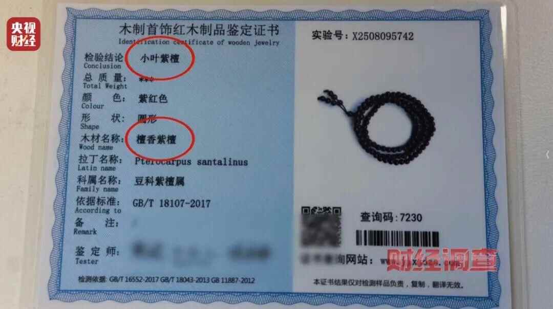 记者拿到的证书标注“小叶紫檀”“檀香紫檀”。