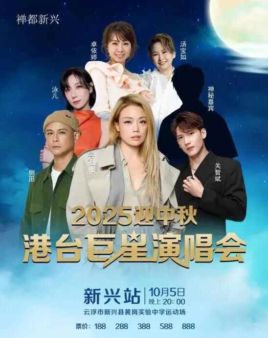 广东省云浮市新兴县黄岗实验中学运动场将于10月5日举办“2025迎中秋 港台巨星演唱会”,演出嘉宾包括容祖儿、泳儿、关智斌等英皇歌手,票价为188元−888元。