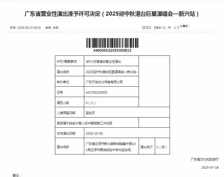 据广东省文化和旅游厅官网显示,该演出已获得广东省营业性演出准予许可决定。