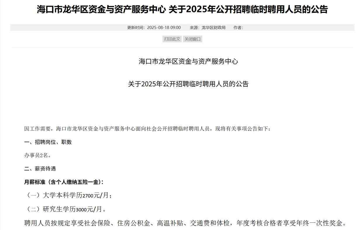 海口市龙华区资金与资产服务中心关于2025年公开招聘临时聘用人员的公告。图/当地政府官网公告截图