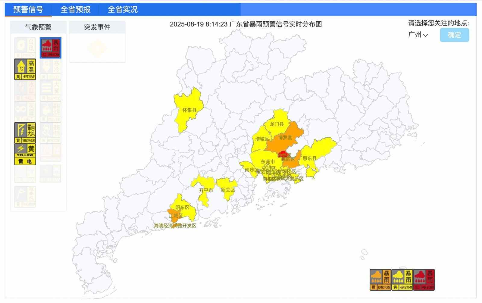 随着热带低压登陆,广东各地均已解除台风预警信号。但截至8月19日8时14分,广东多地仍受热带低压的外围风雨影响。惠州范围内,有市县区发布暴雨红色预警;茂名、阳江范围内,有市县区发布暴雨橙色预警;肇庆、江门、广州、东莞、深圳,有市县区发布暴雨黄色预警信号。