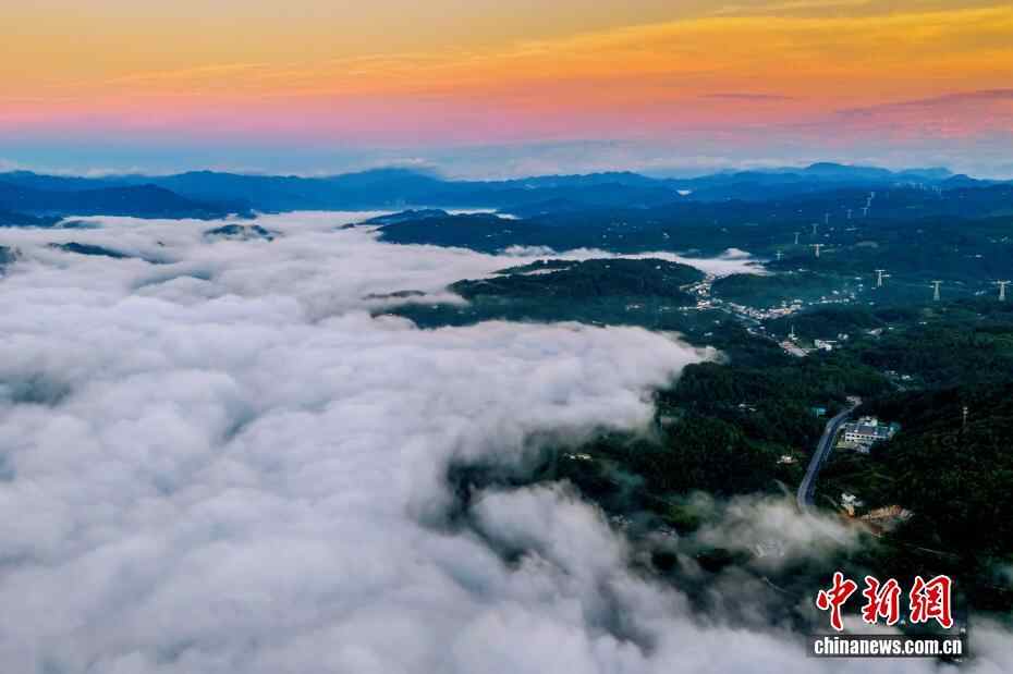 8月18日,湖北省宜都市迎来壮丽日出云海景观。清晨时分,朝阳初升,在宜都市潘家湾土家族乡至王家畈镇之间,金色霞光与漫山云海交相辉映,层层叠叠的云涛随风流动,构成了一幅绝美的自然画卷。图为朝霞云海构成动人的自然画卷。