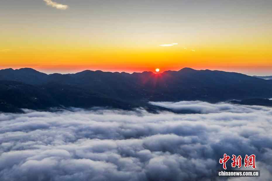 8月18日,湖北省宜都市迎来壮丽日出云海景观。清晨时分,朝阳初升,在宜都市潘家湾土家族乡至王家畈镇之间,金色霞光与漫山云海交相辉映,层层叠叠的云涛随风流动,构成了一幅绝美的自然画卷。图为清晨时分朝阳初升。