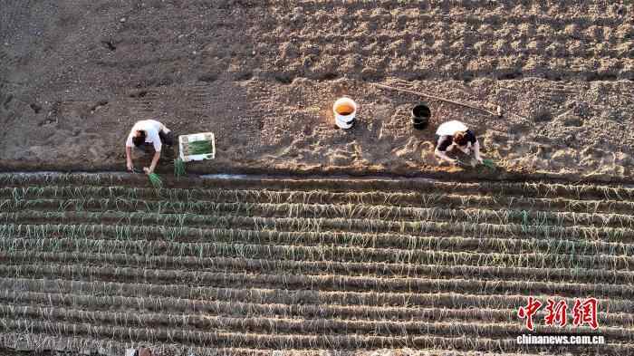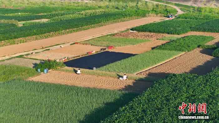 8月17日,安徽省蚌埠市五河县头铺镇方台村沿淮河岸边蔬菜种植基地一片繁忙的景象,农民正在抓住农时进行秋茬香葱移栽。(无人机照片)李向前 摄