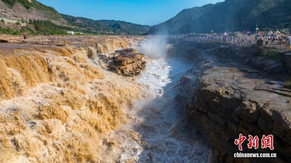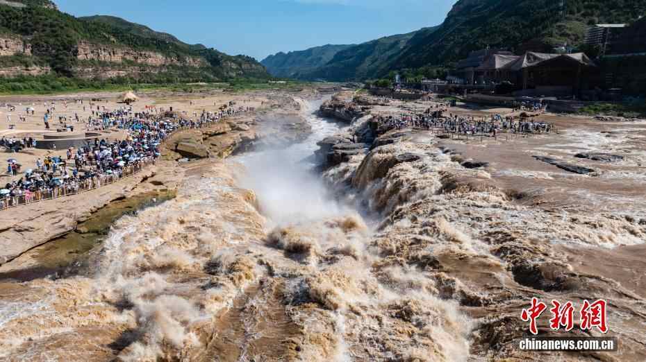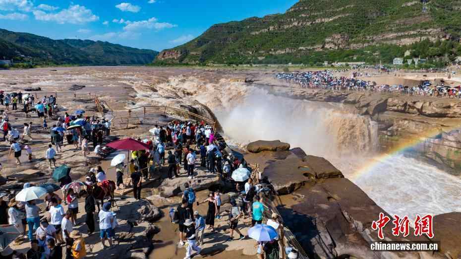 近日,受天气晴好及水汽充足影响,位于陕西延安的黄河壶口瀑布水量大增,在阳光的照射下,瀑布上方出现了一道绚丽的彩虹,与奔腾的瀑布交相辉映,形成了一幅壮丽的自然画卷,吸引众多游客驻足观赏、拍照留念。图为黄河壶口瀑布美景吸引了众多游客。