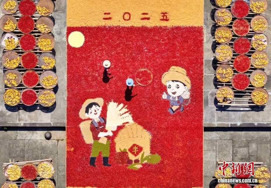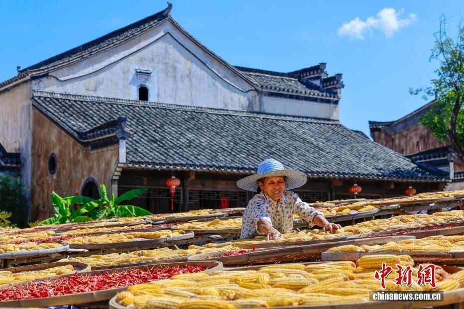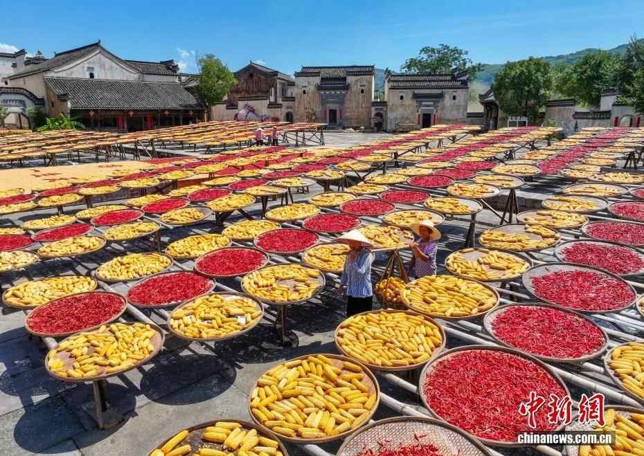 8月18日,安徽省黄山市徽州区呈坎古村迎来了一年一度的“晒秋”盛景。村民们趁着晴好天气,将玉米、南瓜、红辣椒等农作物铺满晒场。五彩斑斓的农作物与徽派古建交相辉映,构成一幅五谷丰登的秋收画卷,吸引众多游客前来感受丰收的喜悦。(无人机照片)