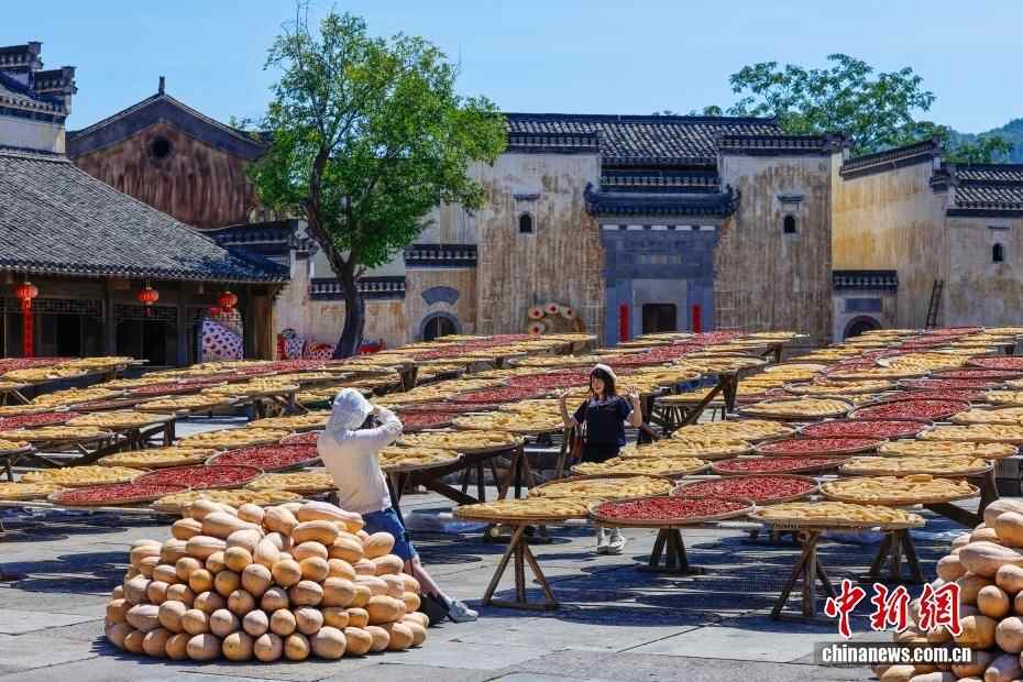 8月18日,安徽省黄山市徽州区呈坎古村迎来了一年一度的“晒秋”盛景。村民们趁着晴好天气,将玉米、南瓜、红辣椒等农作物铺满晒场。五彩斑斓的农作物与徽派古建交相辉映,构成一幅五谷丰登的秋收画卷,吸引众多游客前来感受丰收的喜悦。