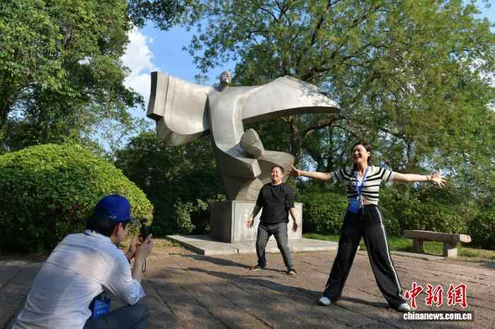 8月18日,2025“青春同行”两岸新媒体创享季安徽交流营活动在马鞍山启幕。近二十位两岸自媒体人走进马鞍山、宣城,开启为期五天的寻迹诗仙李白之旅。图为自媒体人在马鞍山市长江采石矶文化生态旅游区打卡李白雕像。中新社记者 储玮玮 摄