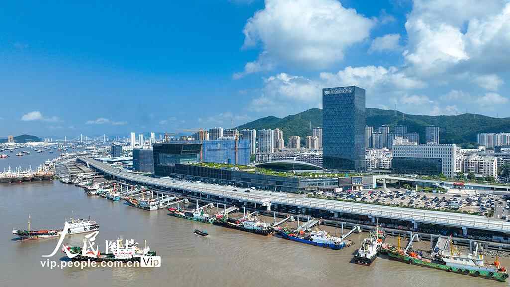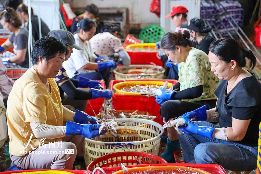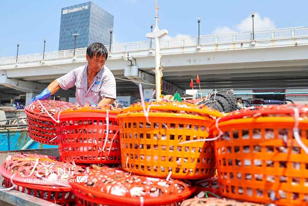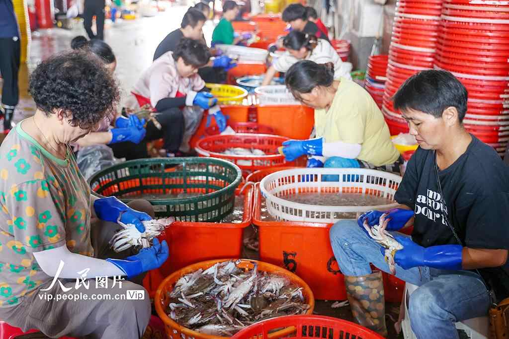 2025年8月18日,浙江省舟山市普陀区舟山国际水产城一派繁忙景象,到港渔船不时靠泊卸货,工人们将一筐筐梭子蟹装车运往水产城内,经营户和工人们正在按级分拣,准备销往各地市场。邹训永摄(人民图片网)