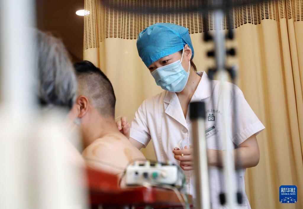 8月18日,在湖北武汉,武汉大学中南医院骨科康复科的主任医师为患者进行治疗。