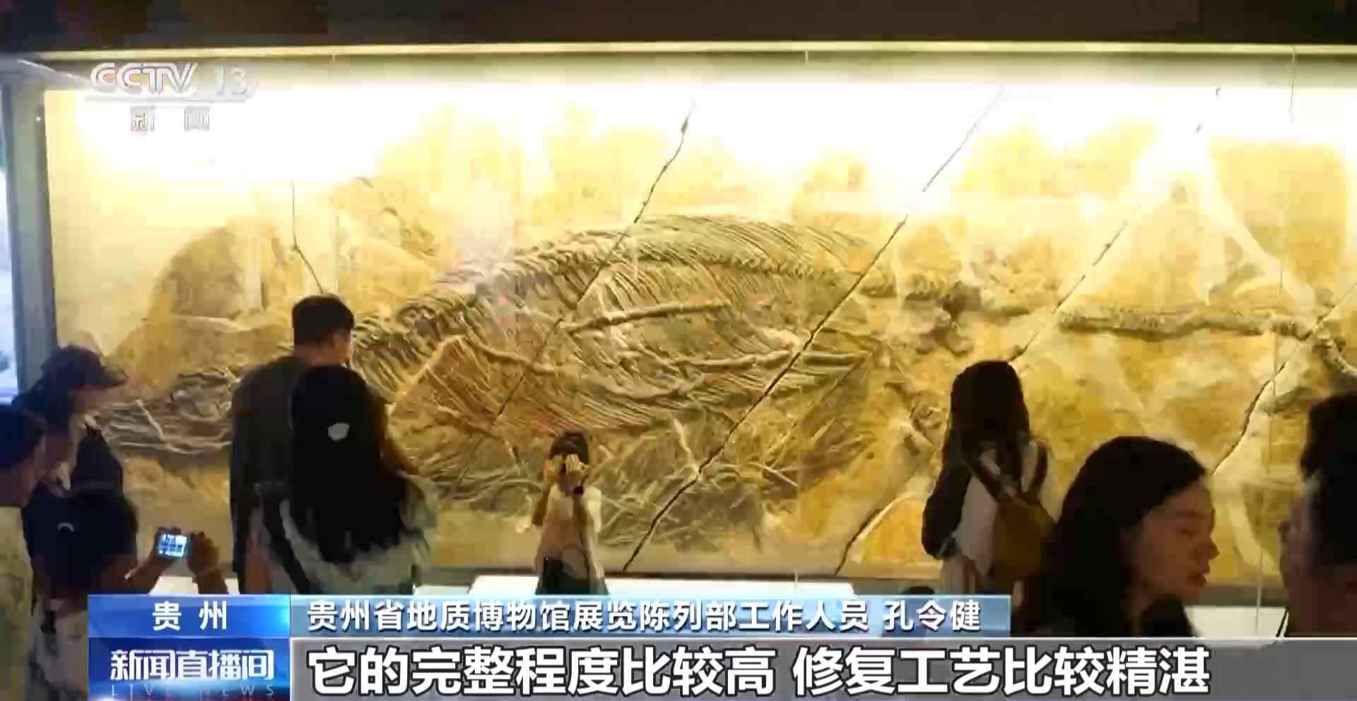贵州省地质博物馆展览陈列部工作人员 孔令健:它的完整程度比较高,修复工艺比较精湛,骨骼保存下来以后,可以看到腹部有三块小的鱼龙标本,对我们研究三叠纪鱼龙化石的生育和繁殖具有极高的科研价值。
