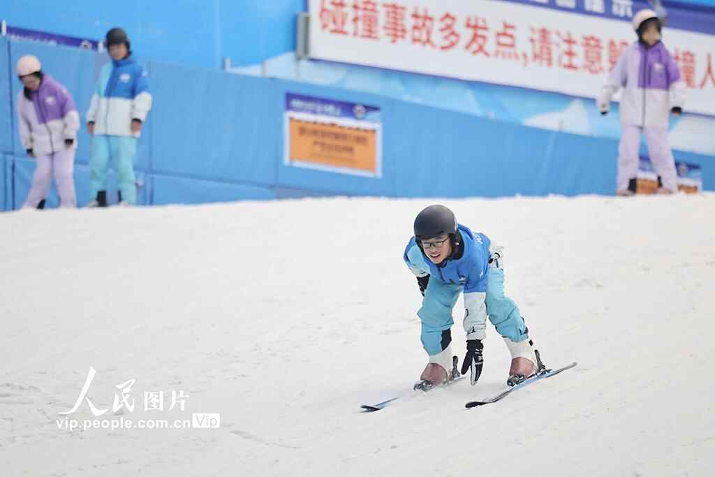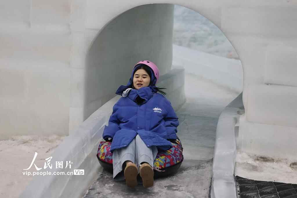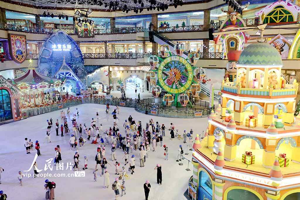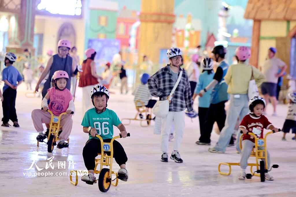 连日来,受副热带高压的影响,江苏省迎来大范围、长时间高温闷热天气,不少市民和游客来到南通森迪冰雪海洋乐园休闲游玩,在“冰雪世界”里享受清凉。徐培钦摄(人民图片网)