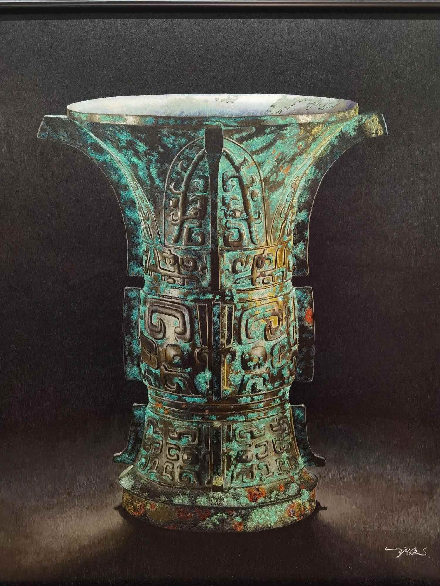 在养病期间,“闲不住”的王新元跑了全国多地的博物馆,他深深地被青铜器吸引,“能不能用广绣表现出它们的历史底蕴?”没钱买相机,他就多去几趟博物馆观察青铜器的颜色和光影,甚至还曾被工作人员误以为是同行。后来,他还买了青铜器相关的书籍细细研究起它们的历史。如今,走在王新元的工作室里,配色多达上千种的青铜器广绣作品时常引来人们的惊叹。