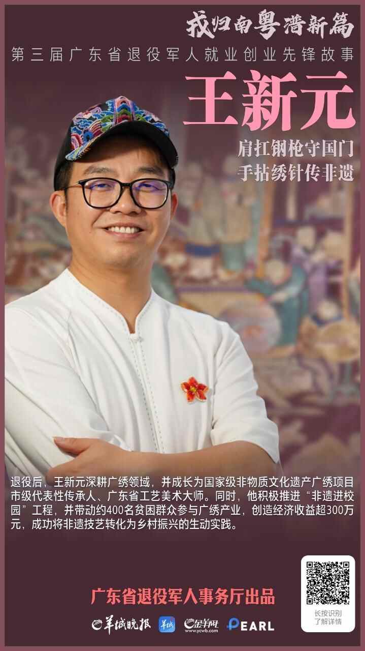 绣色著铁血,丝针续雅意。2025年6月,他把广绣带到自己曾经当兵的新疆,当地学生迫不及待地动手尝试。细细的丝线串起王新元两段最重要的经历,也丈量出他作为退役军人和非遗传承人的理想信念之路。“广绣不是王新元的,但我王新元是广绣的一分子。”他坚定地说。