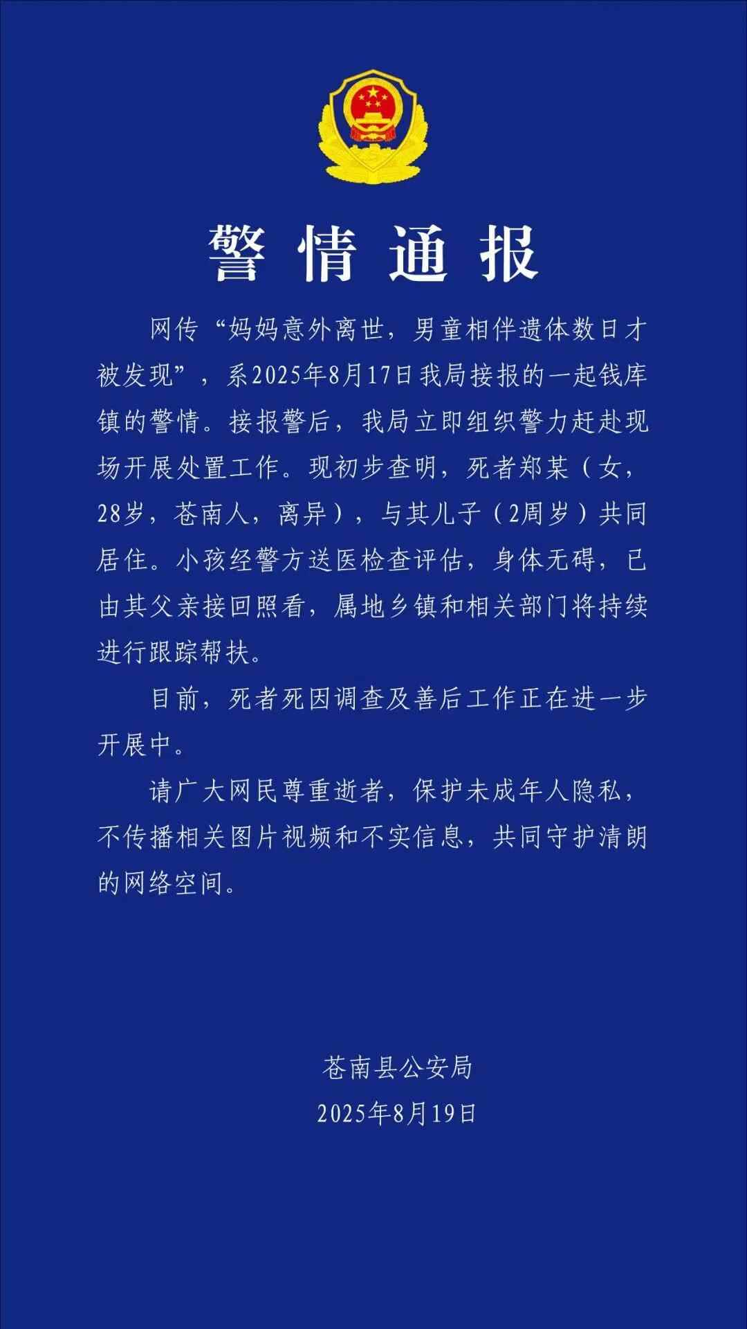 网传 “妈妈意外离世,男童相伴遗体数日才被发现”,系2025年8月17日我局接报的一起钱库镇的警情。接报警后,我局立即组织警力赶赴现场开展处置工作。现初步查明,死者郑某(女,28岁,苍南人,离异),与其儿子(2周岁)共同居住。小孩经警方送医检查评估,身体无碍,已由其父亲接回照看,属地乡镇和相关部门将持续进行跟踪帮扶。