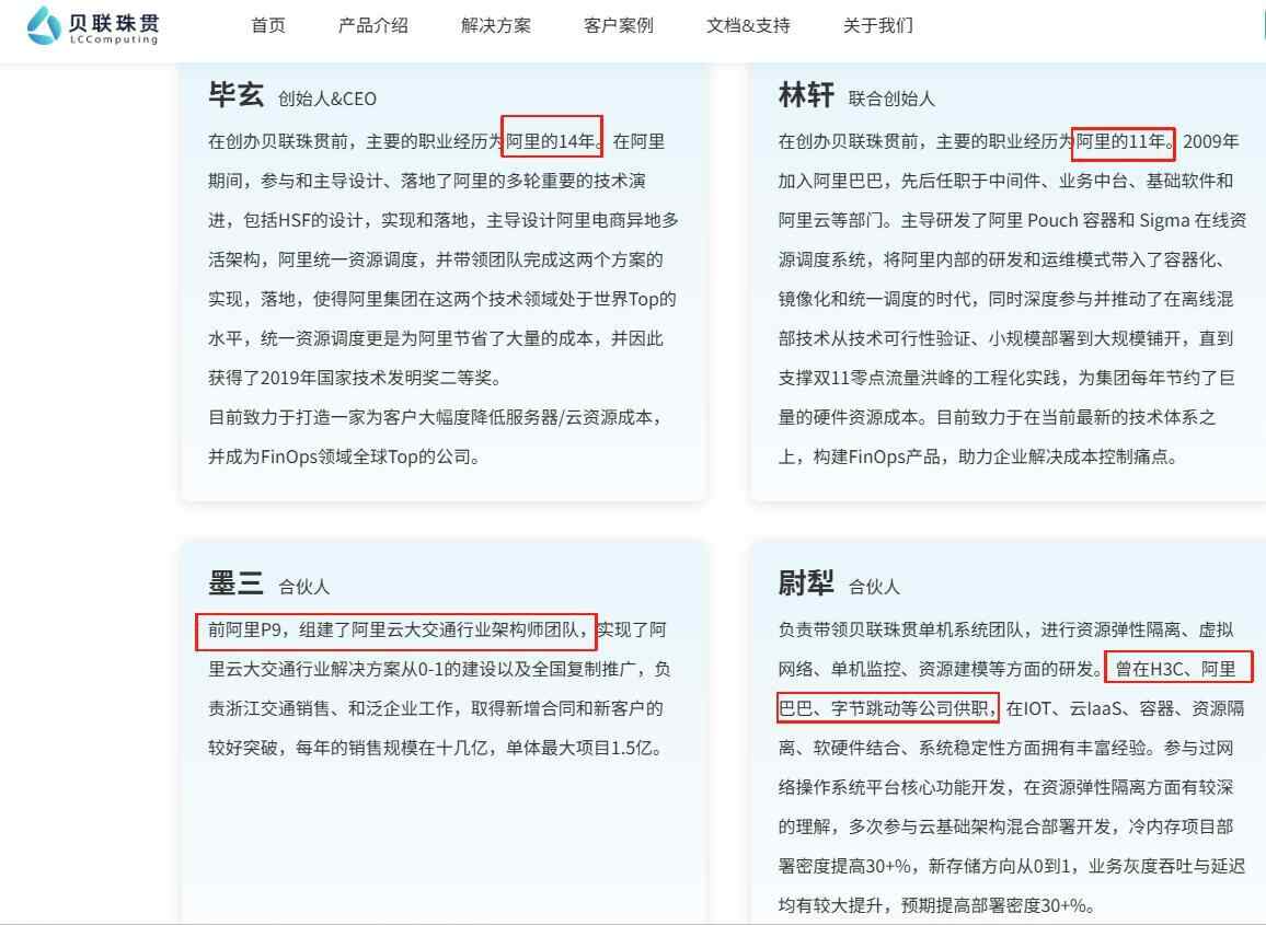 红星资本局浏览贝联珠贯公司的官网发现,该公司的六位核心人员均曾在阿里巴巴工作,如,创始人、CEO毕玄曾在阿里巴巴工作14年,合伙人墨三曾是阿里p9,组建了阿里云大交通行业架构师团队。