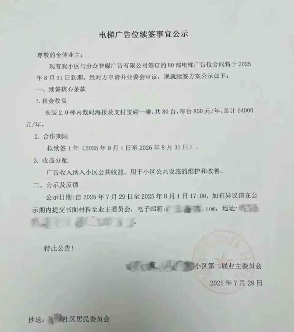 今年7月,杭州一小区还公示了广告屏与“碰一下”的收益:每台800元/年,共80台,总计64000元/年,并写明广告收入将纳入小区公共收益。